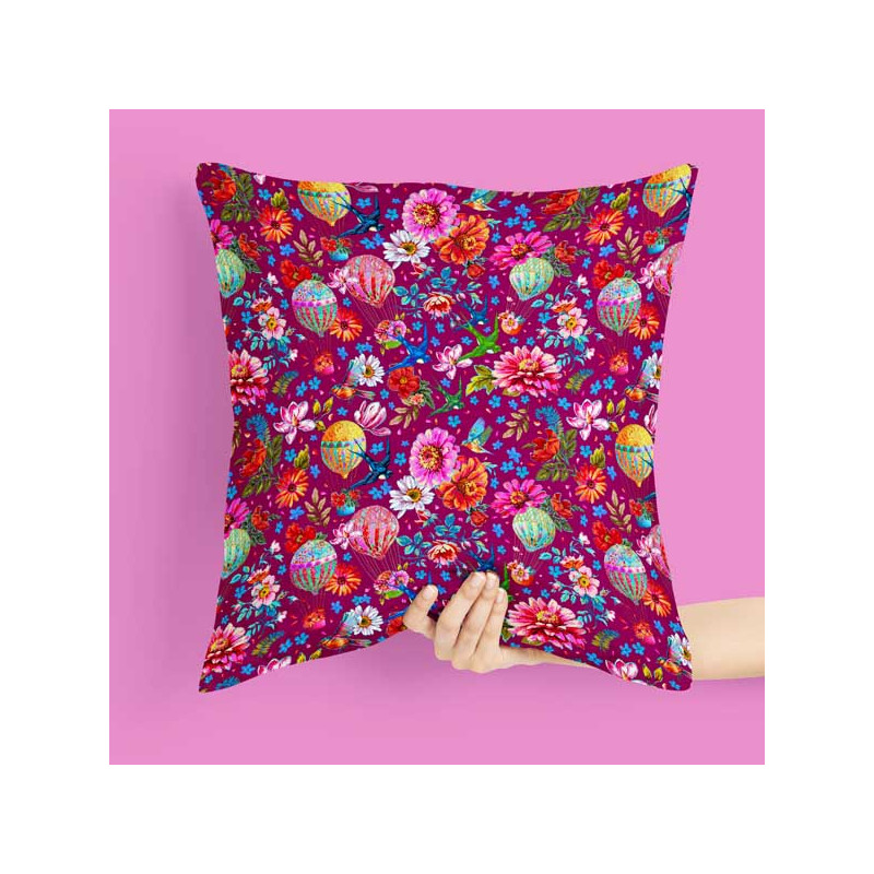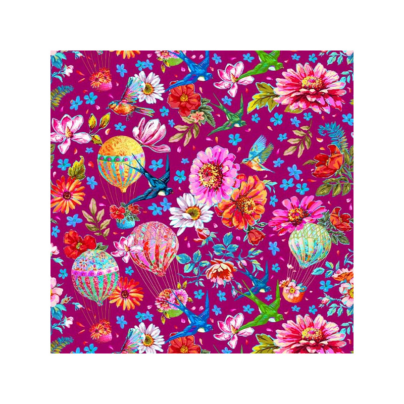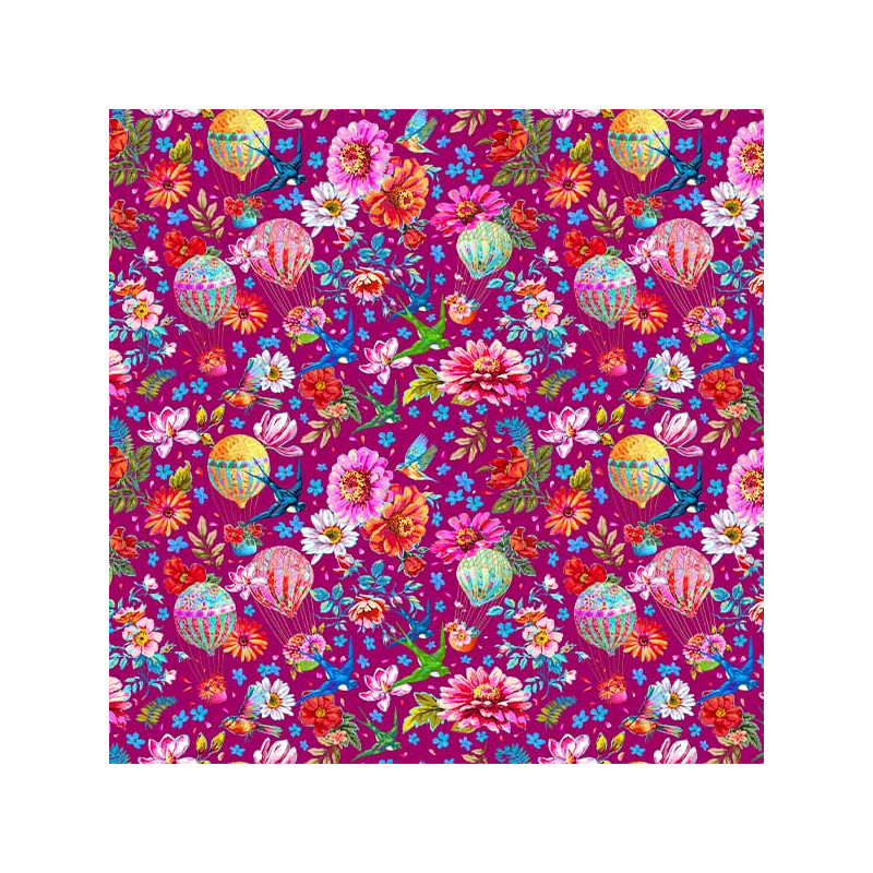 This design combines several motifs from the Festival collection (hot air balloons, swallows, flowers, etc.) in a charming fabric.