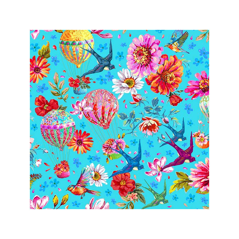 This design combines several motifs from the Festival collection (hot air balloons, swallows, flowers, etc.) in a charming fabric.