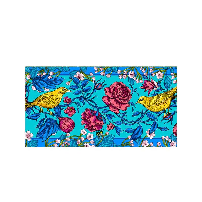 Oiseaux moqueurs, fleurs et fruits composent un motif moins classique qu'il n'y parait...