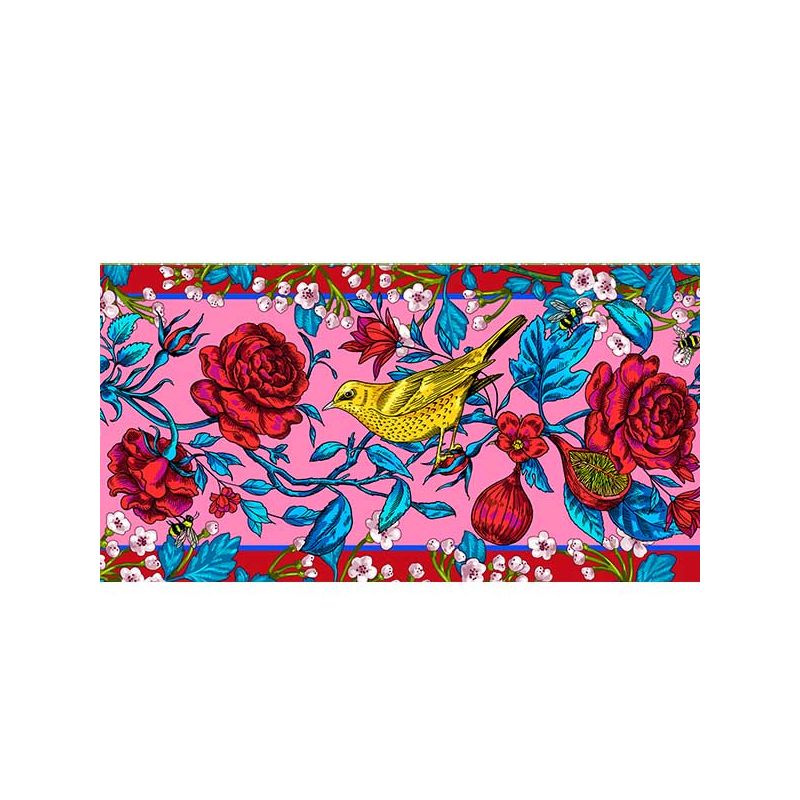 Oiseaux moqueurs, fleurs et fruits composent un motif moins classique qu'il n'y parait...