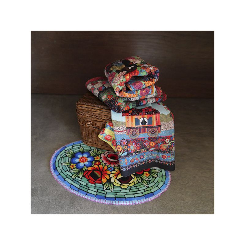 Cette grande illustration sur velours vous fera voyager dans une ambiance nomade et féérique au milieu de paons familiers et de fleurs incroyables.
