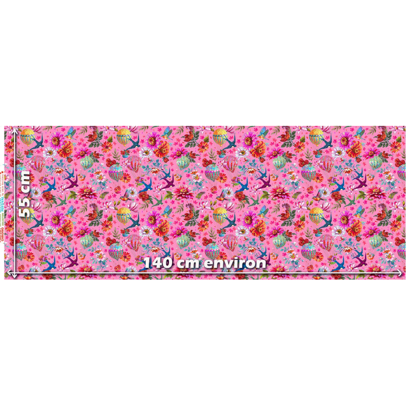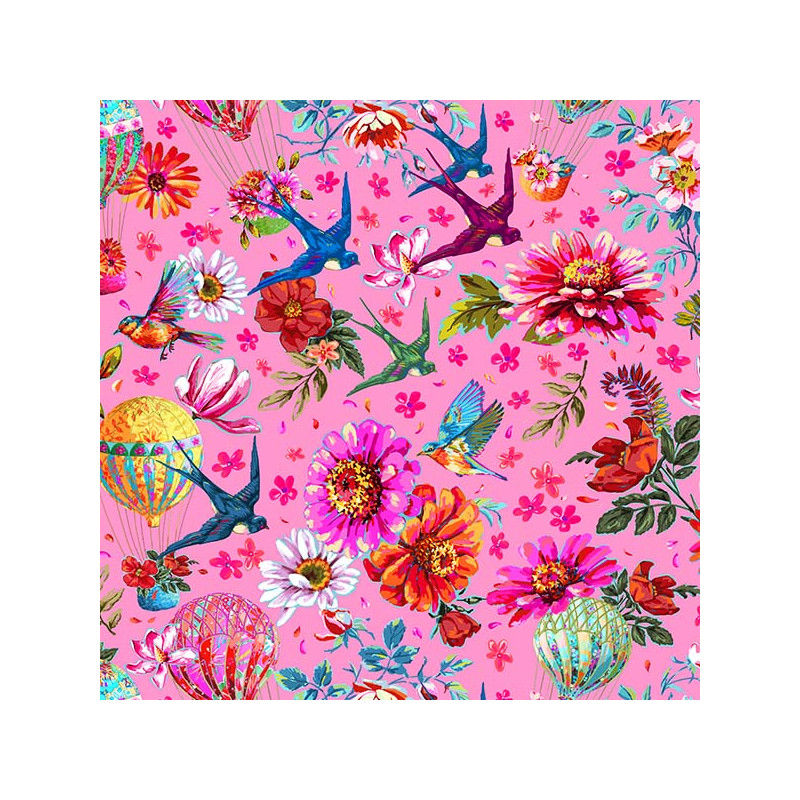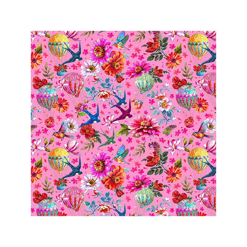 Hirondelles, montgolfières et fleurs se mêlent en vol sur un fond rose