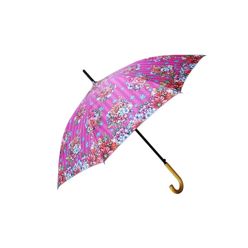 Un parapluie qui mélange avec bonheur des fleurs un peu rétro sur un fond rayé d'un rose éclatant.