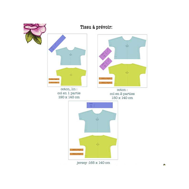 Tissu nécessaire : Blouse 2m en 1.35m de largeur. Robe 3m20 en 1.35m de large. Retrouvez ici nos voiles de coton.