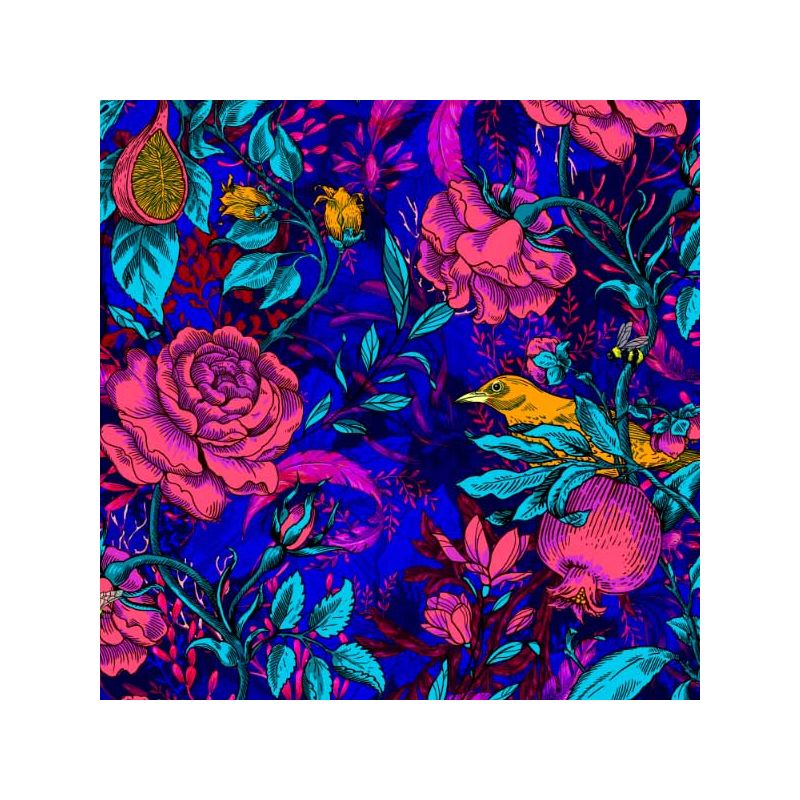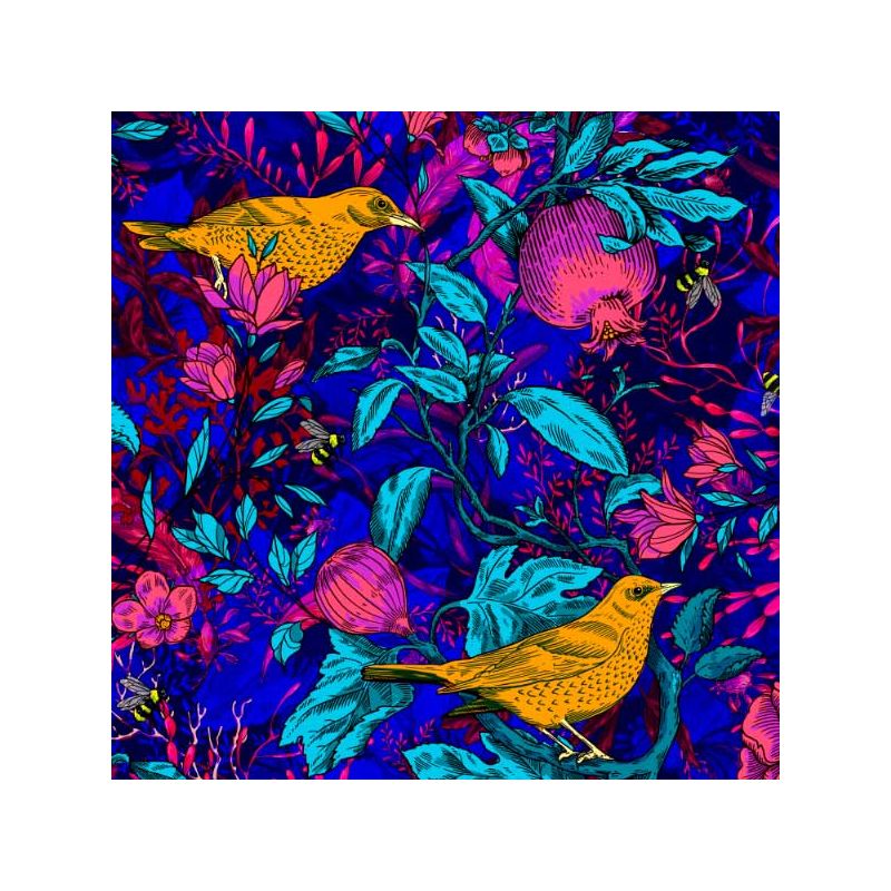 Le joli motif BALI est un branché fleuri et fantaisiste qui abrite des oiseaux colorés.