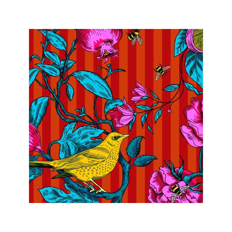 Le joli motif BALI est un branché fleuri et fantaisiste qui abrite des oiseaux colorés.