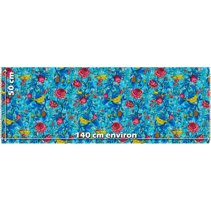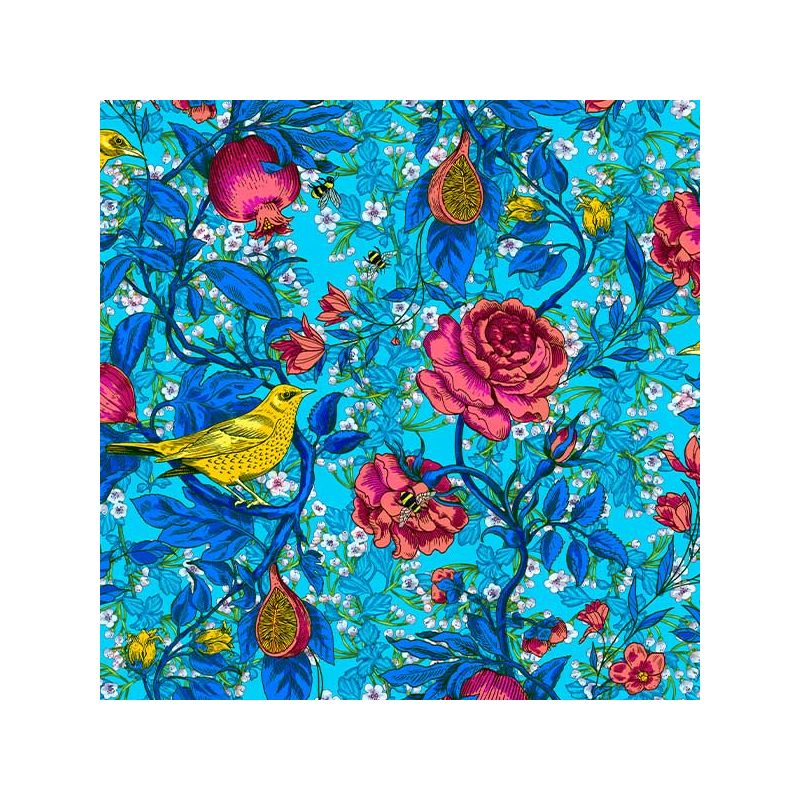 Carpes fleuries, oiseau bigarrés, bouquets épanouis, tout se mêle avec poésie et douceur sur ce velours éclatant.