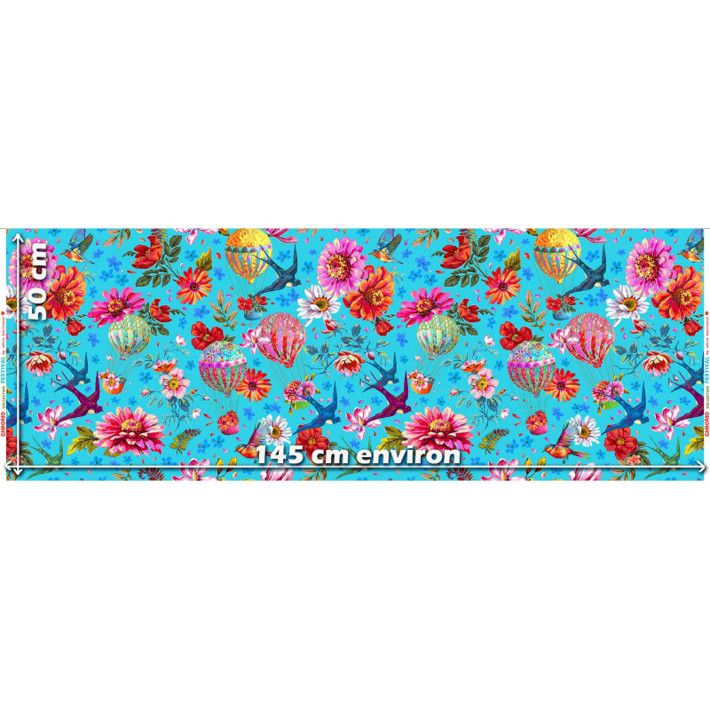 Ce dessin rassemble plusieurs motifs de la collection Festival (montgolfières, hirondelles, fleurs..) en un tissu plein de charme.